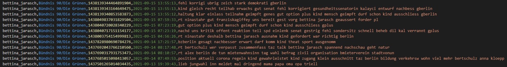 Using this query, I received a .csv via a cURL request with the necessary data to read the people into a Python script. That allowed me to start dealing with downloading the actual tweets. After many, many hours of work (mostly because of library issues, since many still couldn't properly handle Twitter API version 2), I arrived at a reasonably satisfactory result that fulfilled the data download function. The biggest disadvantage of the implementation in this result via Tweepy was - and still is - the very time-consuming execution: downloading the last 200 tweets from 900 accounts takes the downloader more than 21 hours. Still, the result is very rewarding: 70,000 tweets in one file, neatly compiled as comma-separated values with account name and corresponding parliamentary group.
